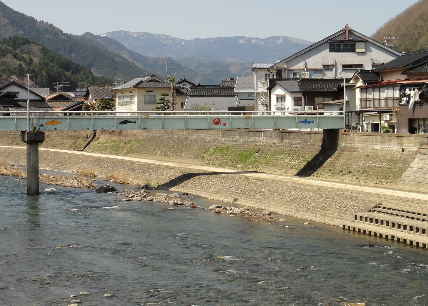 山にはまだ雪が残っています。桜はほぼ満開になっています。